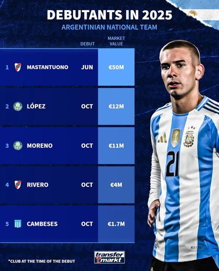 北京时间10月16日消息,德国转会市场网站公布了预计在2025年完成阿根廷国家队首秀的球员名单,其中今夏加盟皇家马德里的马斯坦托诺位居榜首。
